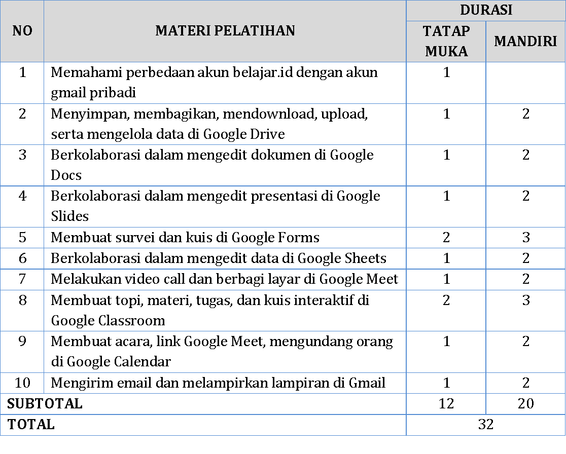 Tujuan Pelatihan ini adalah mengenalkan dan mengoptimalkan penggunaan akun belajar.id dan fitur-fitur Google Suite for Education untuk keperluan pembelajaran. Peserta akan mendapatkan materi seperti yang tercantum di dalam struktur program berikut.